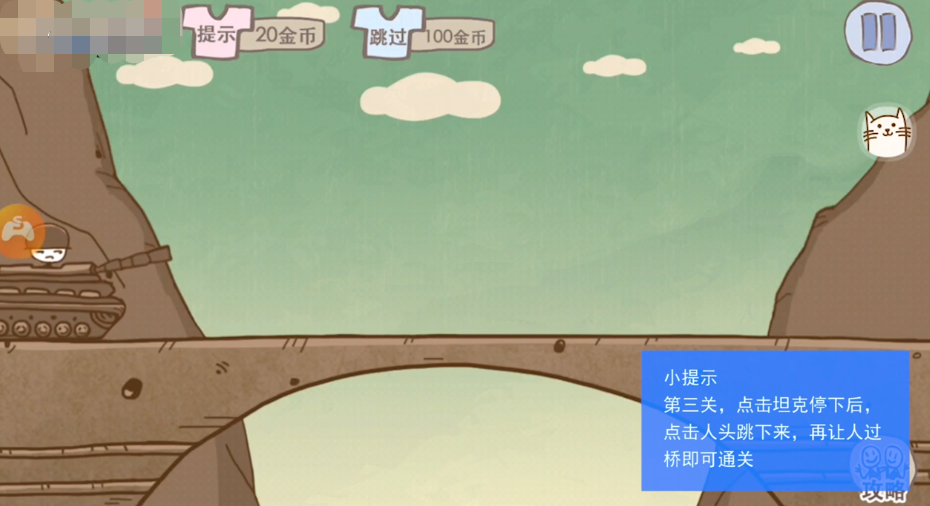 点击“坦克”停下后,点击“人头”跳下来,再让人过桥即可通关。