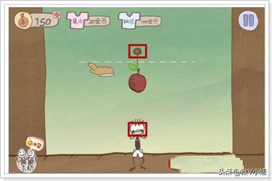第六关:这关也是不要给误导咯,点击红框就是苹果上方挂着的按钮,然后等少年的嘴巴张开吃掉就过关了。