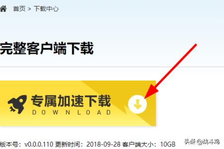 7、在下载游戏的页面,往下拉能看到下载完成游戏客户端的下载框。点击黄色框旁边的向下的箭头,就可以下载游戏了。下载好之后就可以进入游戏。