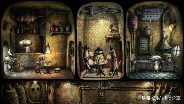 常用在末世题材作品中的机器世界,在《机械迷城》里却被表现得非常有爱、和谐。这一切得归功于机械迷城诙谐幽默的表现手法,塑造了许多有血有肉个性鲜明的机器人,配合全手绘的精致画面,这俨然就是一个机械乌托邦,不会有《Year Walk》、《The Room》等很多其它解谜游戏带有的惊悚神秘元素。